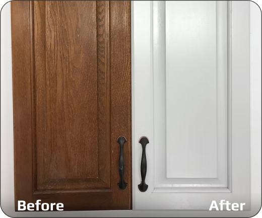 Our Cabinet Exclusive Enamel Process is another premium option that delivers a smooth, elegant finish with excellent durability. This specialized cabinet coating features self-leveling technology, which allows the paint to settle evenly and create a factory-smooth finish free from heavy brush marks or uneven texture.
