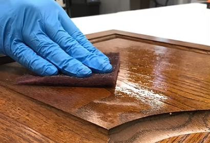 Before any refinishing work begins, we thoroughly clean the cabinet surfaces to remove dirt, grease, and other contaminants.